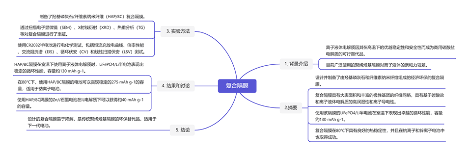 1、设计并制备了一种由羟基磷灰石和纤维素纳米纤维组成的复合隔膜,具有高润湿性和离子导电性,适用于离子液体电解质的安全锂离子电池。