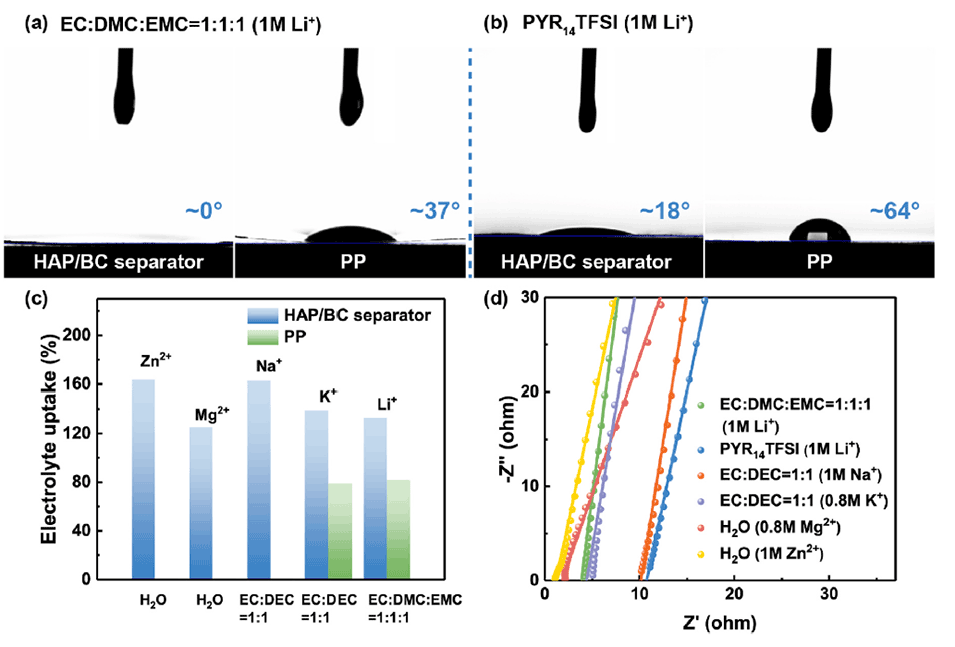 图2 PP和HAP/BC隔膜的电解质润湿性和电导率比较。
