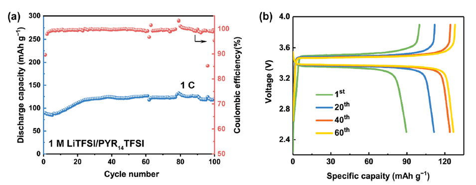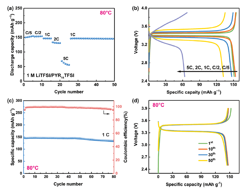 图3 用IL电解质(PYR14TFSI中1 M LiTFSI)制备LFP/Li半电池的室温电化学性能。