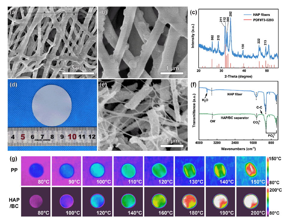 图1:(a, b) 700◦C热处理后HAP纤维的SEM图像;(c) 700◦c处理HAP纤维的XRD谱图;(d) HAP /BC隔膜的数码照片和(e)扫描电镜图像;(f) HAP纤维和过滤后的HAP/BC隔膜的FTIR光谱。(g)不同温度下PP(上图)和HAP/BC分离器(下图)的红外热像图。