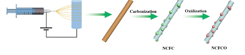1、通过对含有铁源的静电纺丝纳米纤维进行碳化和退火,合成了氮掺杂碳纳米纤维(NCNF)负载的 Fe3C/Fe2O3纳米颗粒(NCFCO)复合材料。