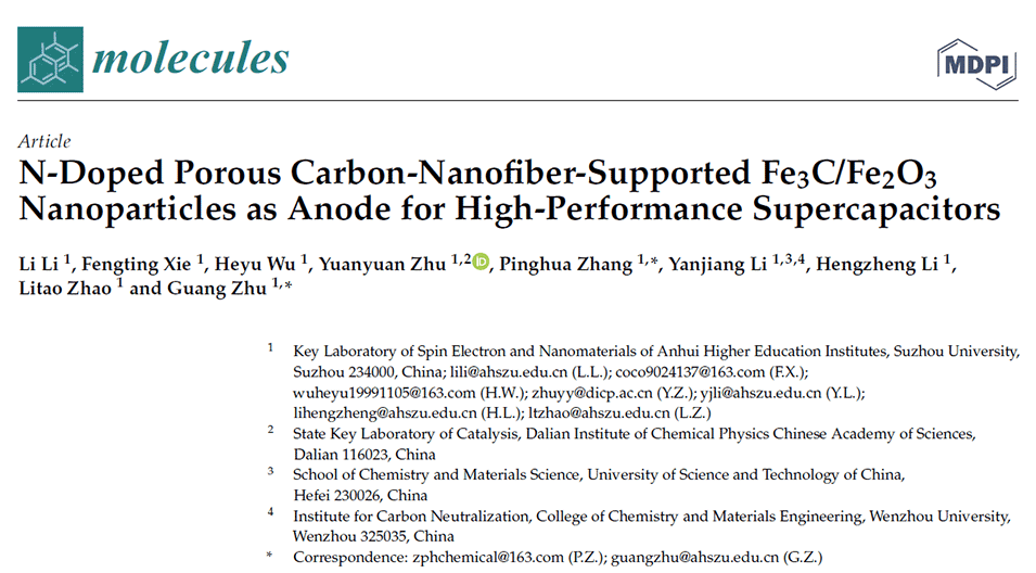 近期,中科院北京纳米能源所朱光研究员等人利用氮掺杂多孔碳纳米纤维负载 Fe3C/Fe2O3 纳米粒子,开发了一种高性能超级电容器的负极材料。相关研究成果以“N-Doped Porous Carbon-Nanofiber-Supported Fe3C/Fe2O3 Nanoparticles as Anode for High-Performance Supercapacitors”为题目,发表于期刊《Molecules》上。