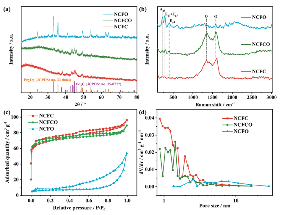 图3 (a) XRD谱图,(b)拉曼光谱图,(c) N2吸附-解吸等温线,(d) NFC、NCFCO和NCFO的孔径分布。