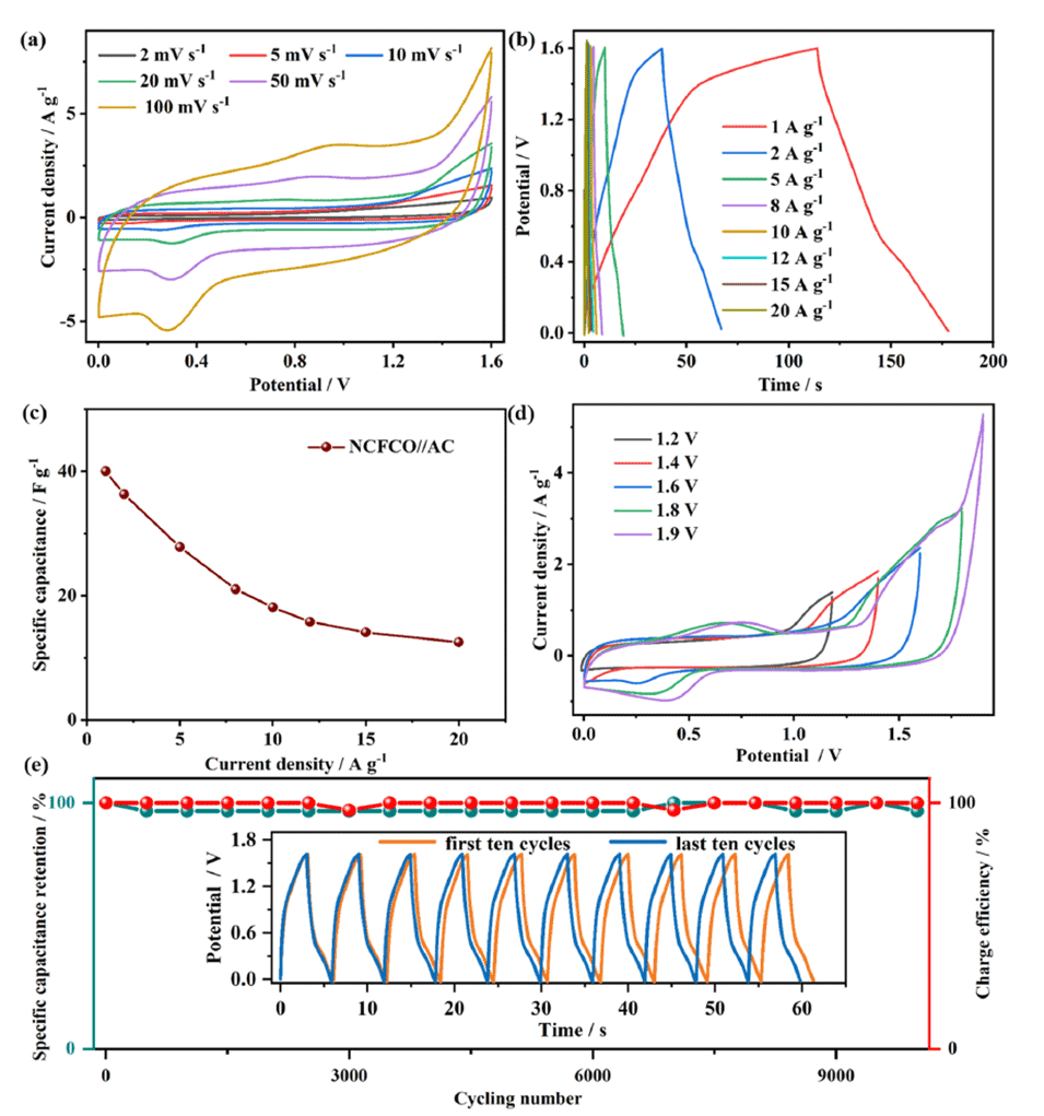 图5:(a) CV曲线,(b) GCD图,(c)比电容与电流密度图,(d)不同电压窗下10mv s−1的CV曲线,以及(e) NCFCO//AC器件的循环稳定性和相应的充电效率。