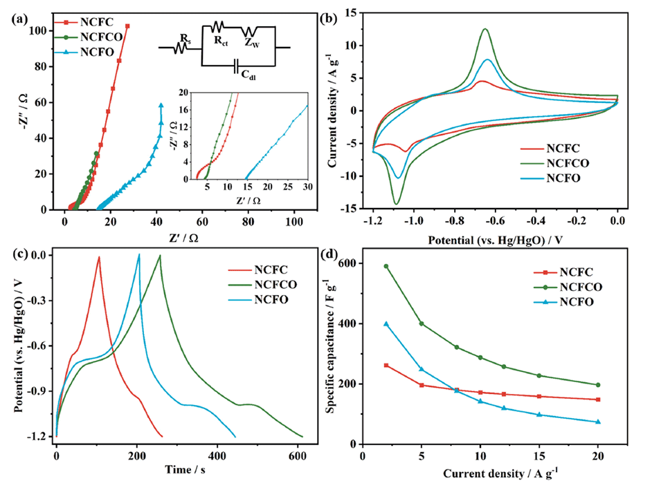 3、所获得的 NCFCO 在 2 A g−1下产生1 F g−1的高比电容,优于 NCNF 支持的 Fe3C 纳米颗粒(NCFC,261.7 F g−1)和 NCNFs/Fe2O3(NCFO,398.3 F g−1)。