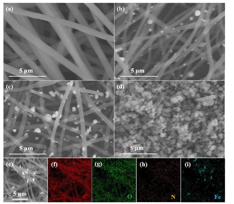 图2 (a) ECNF,(b) nfc,(c) NCFCO,(d) NCFO的SEM图像。NCFCO的(e)SEM图像和(f) C、(g) O、(h) N、(i) Fe的相应元素映射。