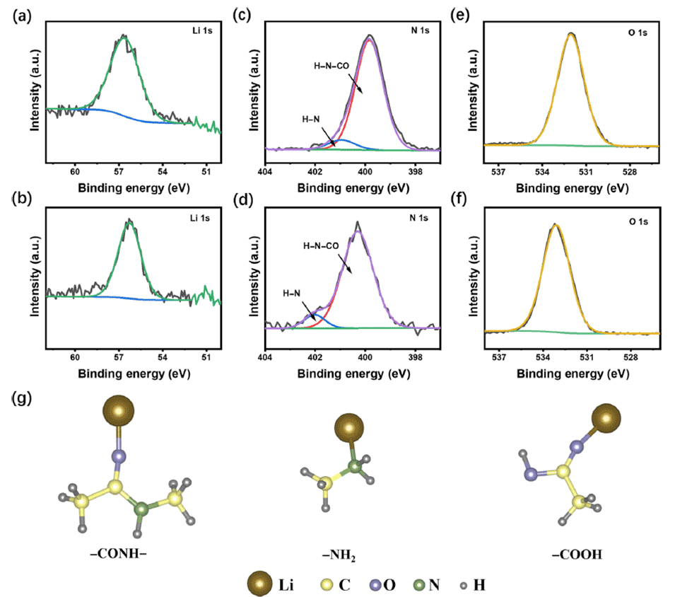 图2. (a) LiPF6和(b) HFP-GN吸附LiPF6后的Li1s峰XPS光谱。(c, e) HFP-GN和(d, f) HFP-GN吸附LiPF6后的N1s、O1s峰的XPS光谱。(g) Li+分别被GN中不同极性基团吸附的优化结构。