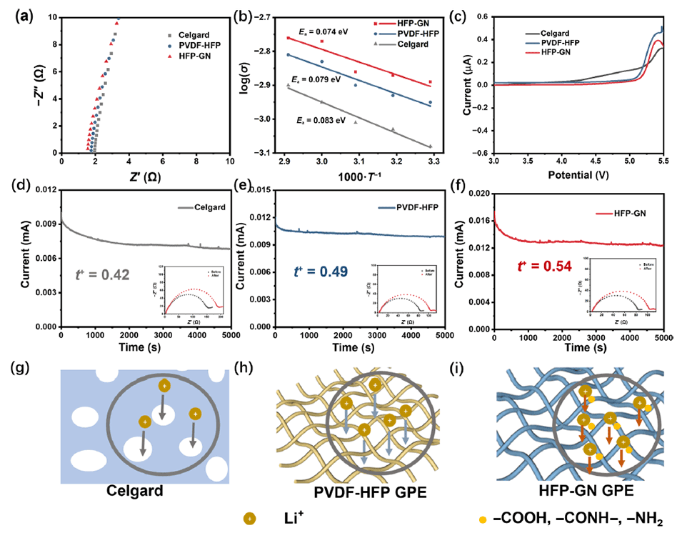 图3 Celgard、PVDF-HFP和HFP-GN的电化学性能:(a) EIS曲线,(b) Arrhenius图,(c) LSV曲线,(d-f)使用Celgard、PVDF-HFP GPE和HFP-GN GPE组装的Li//Li电池的电流-时间曲线(插图为极化前后的EIS图)。(g-i) Celgard、PVDF-HFP GPE和HFP-GN GPE的离子迁移示意图。