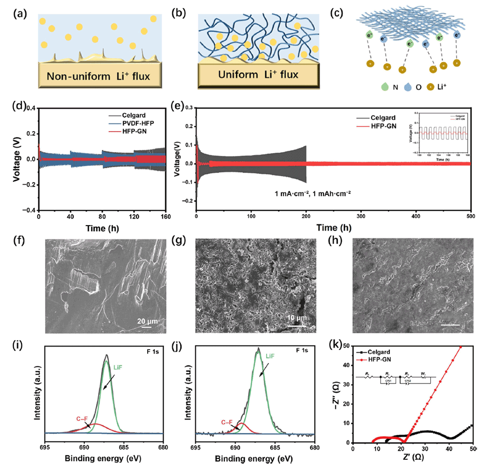 图1 (a) HFP-GN GPEs制备示意图。(b)和(c) PVDF-HFP和HFP-GN的表面。(d) HFP-GN截面。(e) PVDF-HFP、GN和HFP-GN的XRD谱图,(f) FTIR谱图。(g)应力-应变曲线。(h)三种膜的接触角。(i)电解质摄取和电解质保留PVDF-HFP和HFP-GN。(j) PVDF-HFP和HFP-GN的阻燃性能。