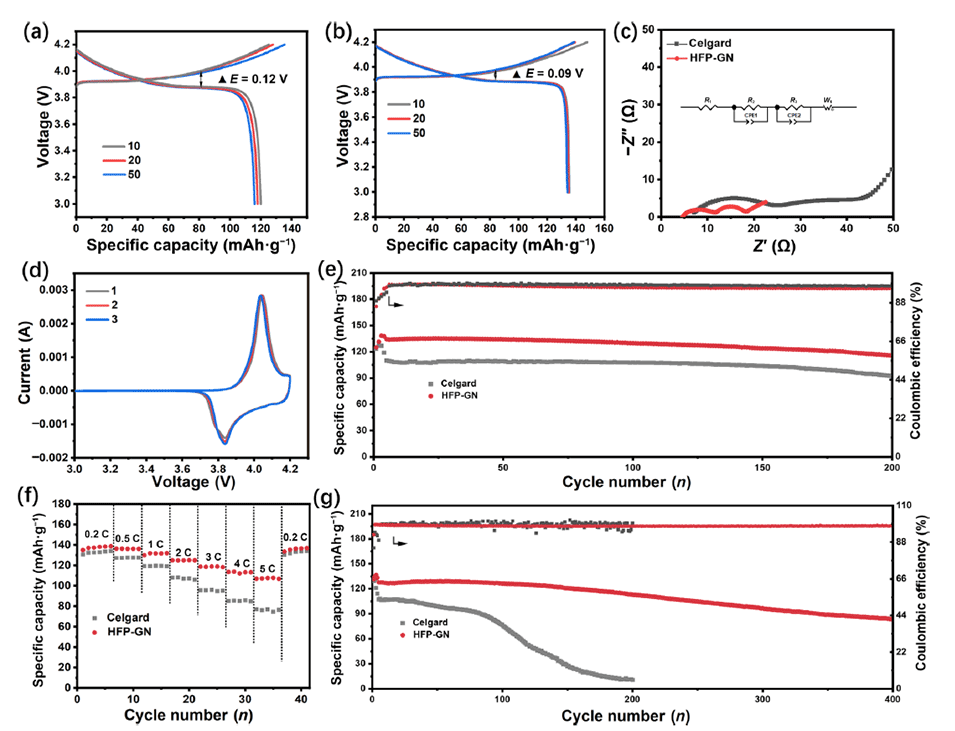 图5. 由Celgard和HFP-GN GPE组装的LiCoO2//Li电池的电化学性能:(a) LiCoO2/Celgard/Li和(b) LiCoO2/HFP-GN GPE/Li在1C下的充放电曲线;(c)电化学阻抗;(d) LiCoO2/HFP-GN GPE/Li在1 mV s-1下的CV曲线;LiCoO2//Li电池在(e) 1C和(g) 2C下的循环性能,(f) LiCoO2//Li电池的倍率性能。