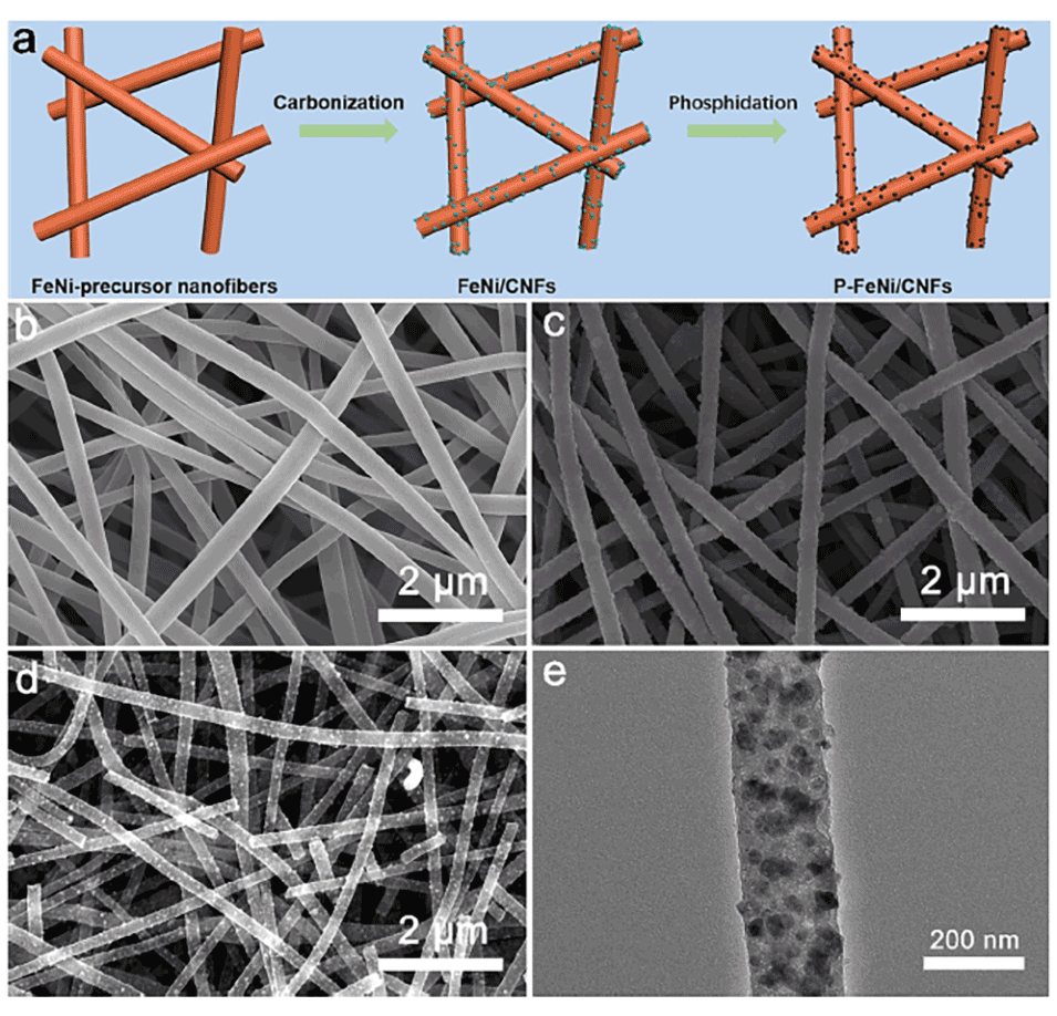 图1 (a) P-FeNi/CNFs的合成过程。(b) Fe1Ni2/PAN纳米纤维,(c) Fe1Ni2/CNFs, (d) P-Fe1Ni2/CNFs的FESEM图像。(e) P-Fe1Ni2/CNFs的TEM图像。