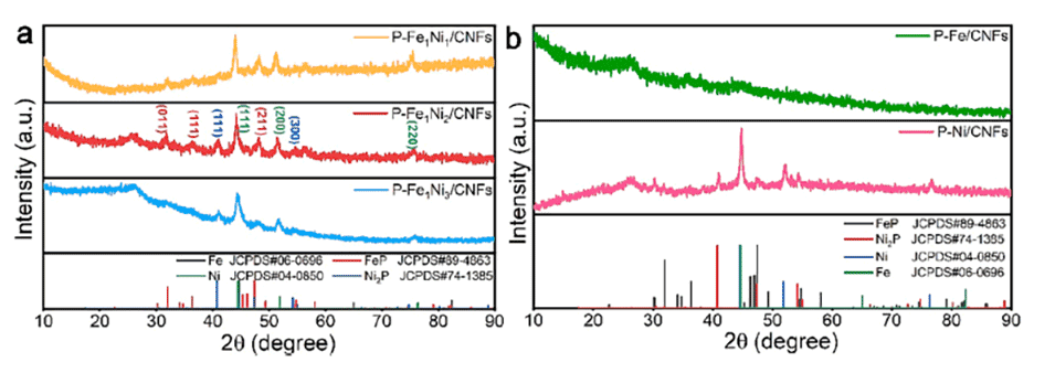 图2 (a) P-Fe1Ni1/CNFs、P-Fe1Ni2/CNFs和P-Fe1Ni3/CNFs的XRD谱图。(b) P-Fe/CNFs和P-Ni/CNFs的XRD谱图。