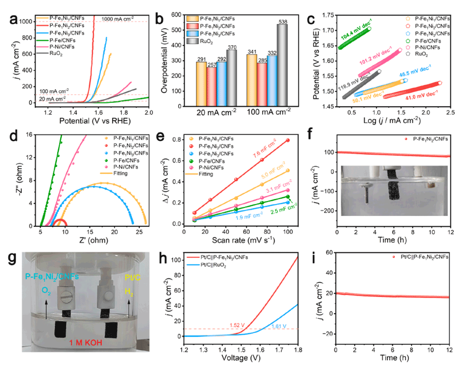 图5 (a) - (f): 1 M KOH溶液中OER的电化学测量。(a)不同样品经iR校正后的LSV曲线。(b)不同样品在20和100 mA cm-2下的过电位。(c) LSV极化曲线对应的Tafel图。(d)不同样本的奈奎斯特图。(e)由不同催化剂的电容电流密度与扫描速率计算的Cdl。(f)碳纸上P-Fe1Ni2/CNFs在1.606 V / RHE下的计时电流测试。(g) -(i):在1 M KOH溶液中,在双电极系统中进行整体水分解测量。