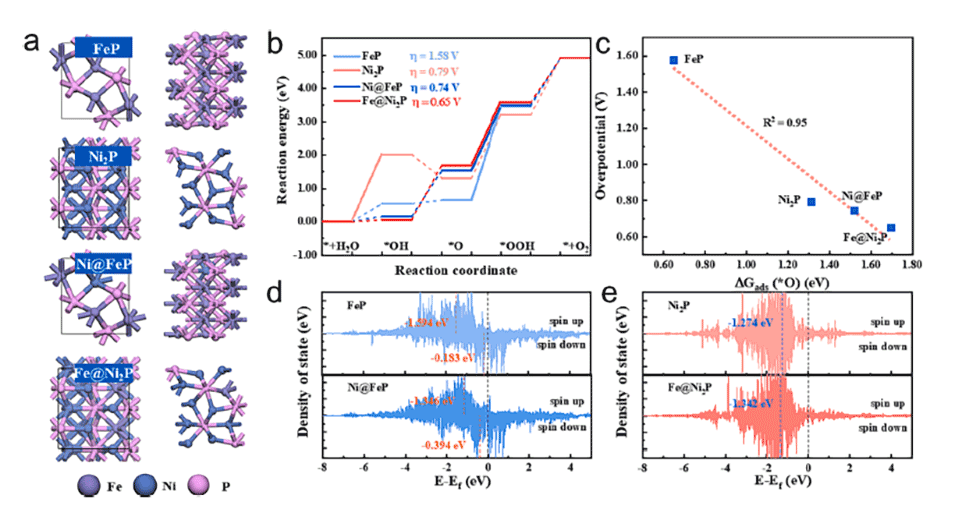 图6 (a) FeP、Ni2P、Ni@FeP和Fe@Ni2P的优化结构;(b) OER在FeP、Ni2P、Ni@FeP和Fe@Ni2P上的反应能;(c) O吸附能与过电位呈线性关系。(d) FeP, Ni@FeP和(e) Ni2P, Fe@Ni2P的状态投影密度。