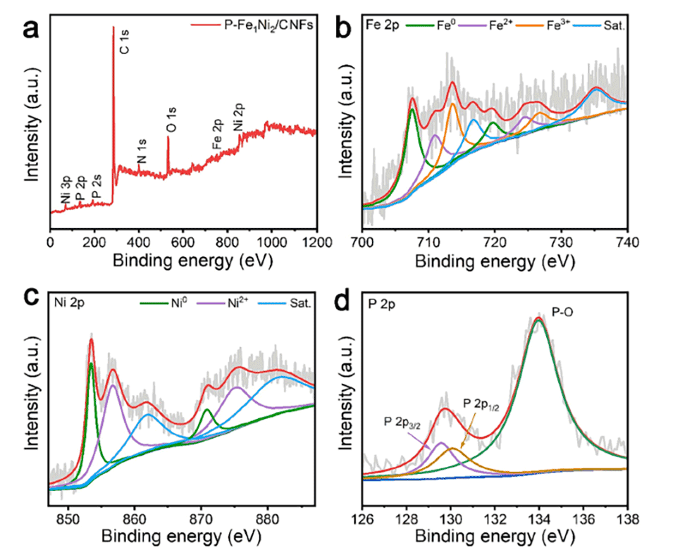 图4 P-Fe1Ni2/CNFs的XPS光谱。(a)全测谱,(b) Fe 2p谱,(c) Ni 2p谱,(d) p2p谱。
