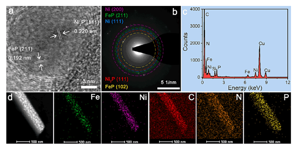 图3 (a)所得P-Fe1Ni2/CNFs的HRTEM图,(b) SAED图,(c) EDX谱。(d) P-Fe1Ni2 /CNFs中Fe、Ni、C、N和P元素的HAADF-STEM显微照片和EDX图谱。