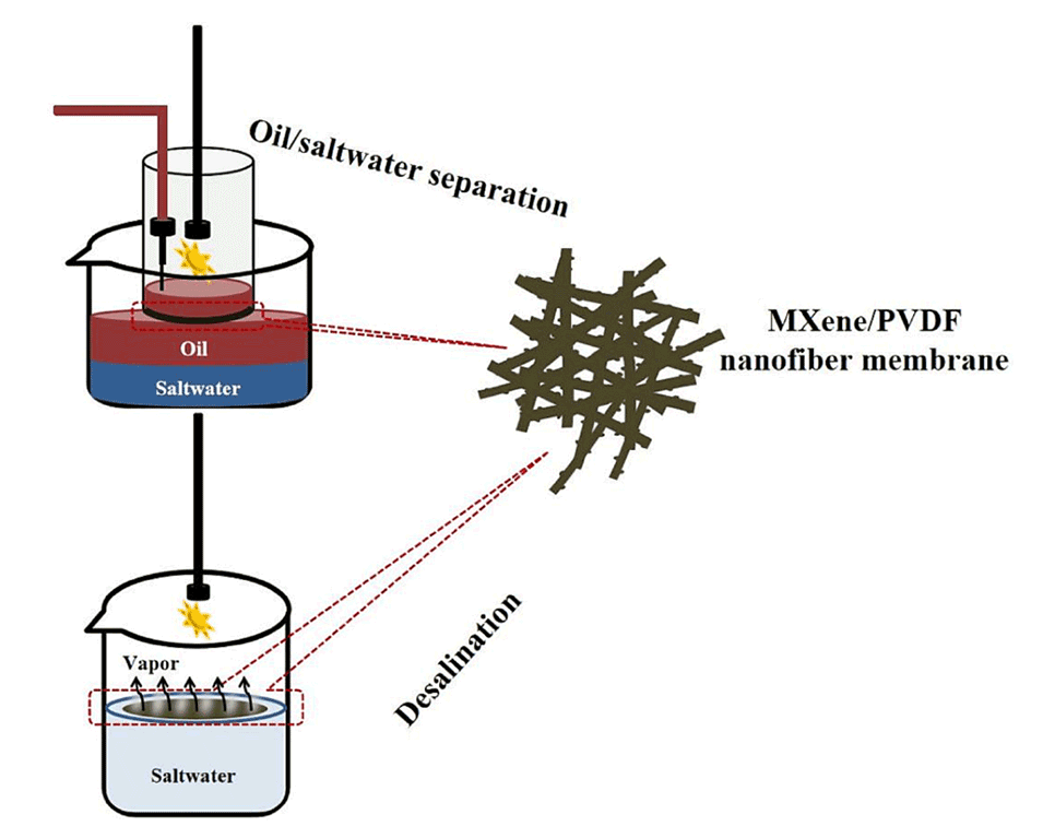 这种整合过程允许MXene和PVDF在纳米纤维膜中发挥协同效应,使其在油水分离和海水淡化应用中具有独特的性能。