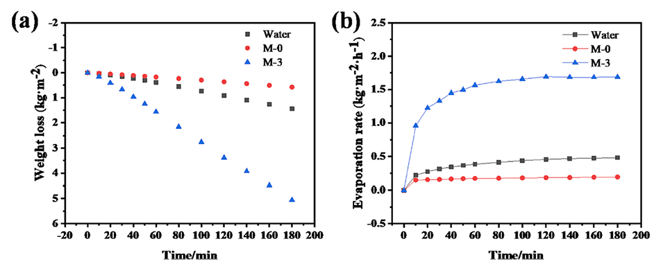 图7 (a)重量损失和(b)在1个太阳照射下水分随时间的蒸发速率。