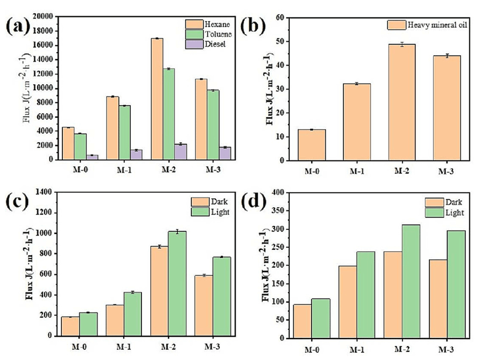 图4 采用(a)-(b)重力驱动、(c)真空过滤装置和(d)自制吸油装置制备膜的油通量。