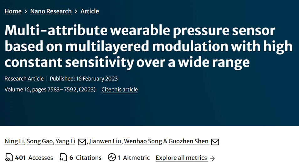 近期,北京理工大学沈国震教授和济南大学李阳教授团队受皮肤表皮多层结构的启发,提出并展示了一种由多层梯度导电聚(ε-己内酯)纳米纤维膜复合材料组成的多属性可穿戴压阻式压力传感器。相关研究内容以“Multi-attribute wearable pressure sensor based on multilayered modulation with high constant sensitivity over a wide range”为题目,发表于期刊《Nano Research》上。