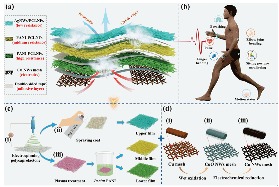 图1.(a)在宽范围内具有高恒定灵敏度的多属性压力传感器的结构图。(b)可穿戴压力传感器人体生理信号监测示意图。(c)压阻层的制备过程。(d)电极的制备过程。