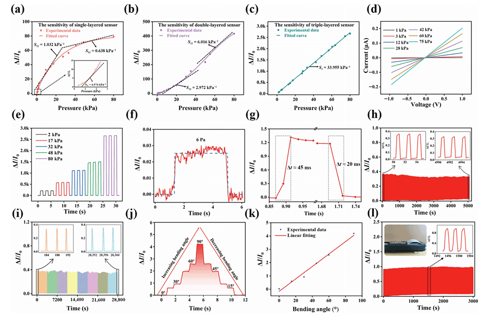 图3.所制备的单层传感器(a)、双层传感器(b)和三层传感器(c)的灵敏度。(d)压力传感器在不同外部压力下的I-V曲线响应。(e)压力传感器在不同垂直压力下的动态响应。(f)压力传感器的检测限(≈6 Pa)。(g)压力传感器的响应-恢复时间响应。(h)在≈100 Pa的垂直压力下测试2500个循环的压力传感器的稳定性。(i)传感器的运行稳定性连续测试8小时。(j)不同手指弯曲状态下的相应相对电流变化。(k)手指弯曲角度与相对电流变化之间的关系。(l)超过1000个周期的弯曲响应。