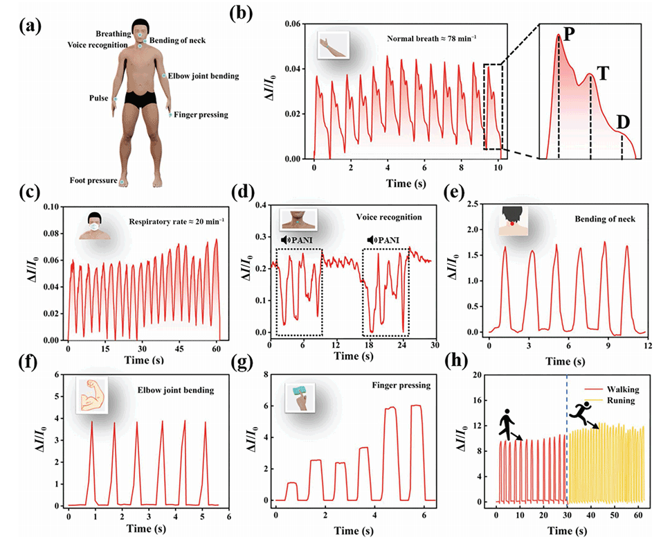 图4.(a)人体生理信号监测示意图。(b-d)信号反应分别来自腕部脉搏(≈78次/分钟)、呼吸频率(≈20次/分钟)和声带振动。(e-f)信号响应分别来自颈部和肘关节的弯曲。(g)手指按压产生的信号响应。(h)走路和跑步产生的信号响应。