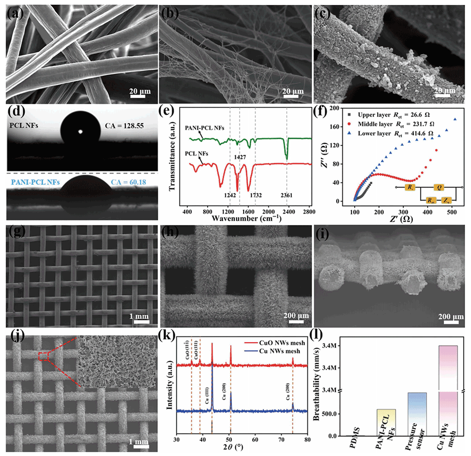图2.(a-c)分别为PCL NFs,Ag NWs/PCL NFs和PANI-PCL NFs的SEM图像。(d-e)分别为PCL NFs和PANI-PCL NFs的接触角和傅氏转换红外线光谱分析仪的测量图像。(f)不同导电纳米纤维膜的EIS测量。(g-h)分别是铜网和氧化铜纳米线网的SEM图像。(i)氧化铜纳米线网横截面的SEM图像。(j)铜纳米线网的SEM图像,插图为SEM图像的局部放大。(k)铜纳米线网和氧化铜纳米线网的XRD图谱。(l)PDMS、PANI-PCL NFs、压力传感器和铜纳米线网的透气性表征。