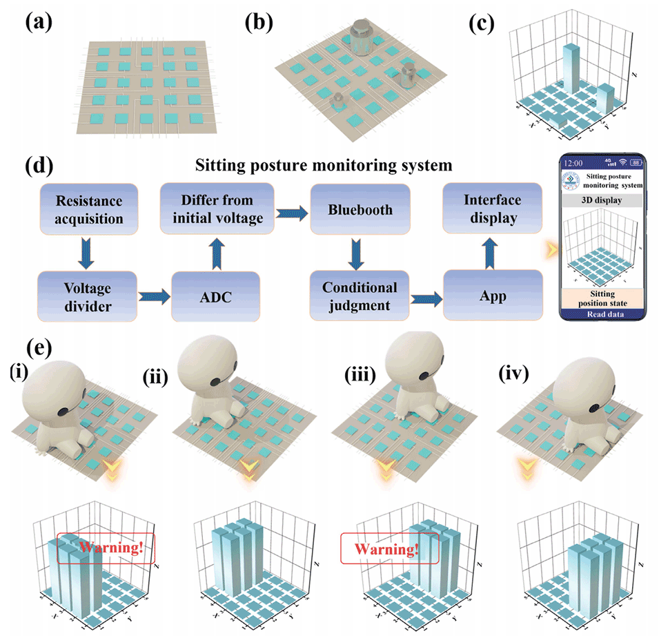 图5.(a)5 × 5传感器阵列的示意图。(b-c)不同位置的三个物体的响应。(d)集成传感器阵列系统操作流程图。(e)用于坐姿监测的集成传感器阵列系统的实时响应,其中,i)和iii)是不正确的坐姿,ii)和iv)是正确的坐姿。