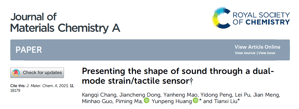 下一代可穿戴电子产品需要具有成本效益、灵活性、灵敏度和多功能的敏感元件。基于此,江南大学刘天西教授和黄云鹏副教授介绍了一种高灵敏度、宽探测范围的超可拉伸双模应变/触觉传感器,及其在监测人体运动和呈现各种声音形状方面的应用。相关研究内容以“Presenting the shape of sound through a dual-mode strain/tactile sensor”为题目,发表于期刊《Journal of Materials Chemistry A》上。