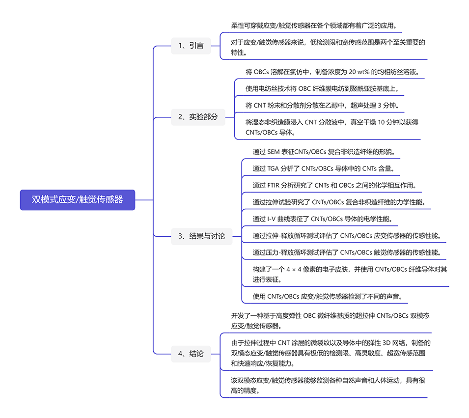 1、该研究开发了一种高度弹性的双模式应变/触觉传感器,具有极低的检测限度、高灵敏度和超宽的检测范围。