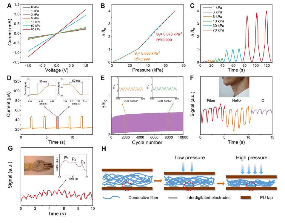 图5 CNTs/OBC纤维导体的压力传感特性。(A)不同外压下的I-V曲线。(B) 0 ~ 70kpa压力范围内的电流响应。(C)不同压力水平下的循环压力传感行为。(D)瞬时压力下的响应/恢复时间。(E)压力传感器在20kpa下压缩速率为2mm min−1时的循环稳定性。(F)使用CNTs/OBC压力传感器实时检测测试员读出不同单词“fiber”、“hello”和“O”时的发声振动。(G)压力传感器在腕部脉搏检测中的应用。(H) CNTs/OBC压力传感器传感机理示意图。