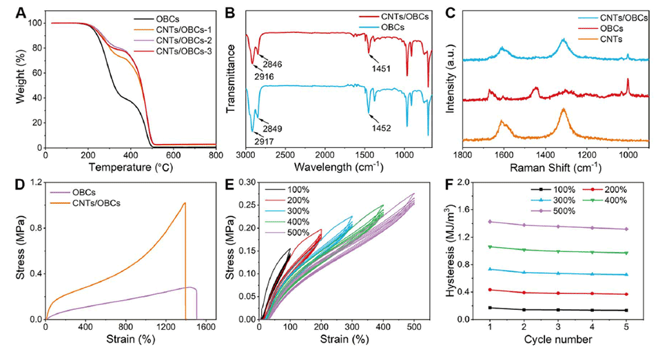 图3 (A)纯OBC和CNTs/OBC微纤维的TGA曲线。(B)纯OBC和CNTs/OBC微纤维的FTIR光谱。(C) OBCs、CNTs和CNTs/OBCs的拉曼光谱。(D) OBC和CNTs/OBC非织造纤维的应变-应力曲线。(E和F)不同应变下CNTs/OBCs前5个循环的应变-应力曲线及相应的滞后量。