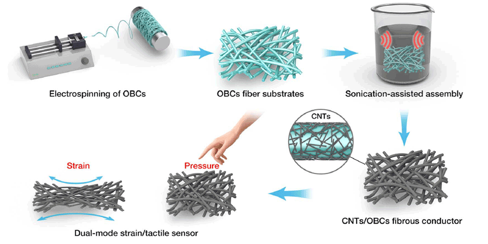 1、通过将皮肤友好的OBC弹性体电纺成高弹性纤维基底,然后采用多功能声波辅助组装策略将碳纳米管(CNTs)牢固且均匀地嵌入OBC微纤维中,开发了具有卓越压阻传感性能的高度弹性纤维导体。