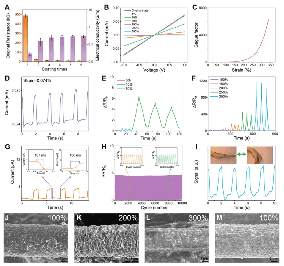图4 (A)不同碳纳米管涂层时间下CNTs/OBCs的电阻和电导率。(B)不同应变下CNTs/OBC(三层碳纳米管涂层)应变传感器的I-V曲线。(C) CNTs/OBC应变传感器的测量因子(GF)与应变的关系。(D-F)不同应变下CNTs/OBC传感器的循环应变传感行为。(G) 1%应变下,拉伸速率为500mm min−1时,传感器的响应/恢复时间。(H) 50%应变下传感器长期稳定性试验。(1) CNTs/OBC传感器检测到的手腕弯曲电阻信号。(J-M) CNTs/OBC复合纤维在逐渐增加的应变下拉伸的SEM图像,从100%到300%,最终恢复到100%。