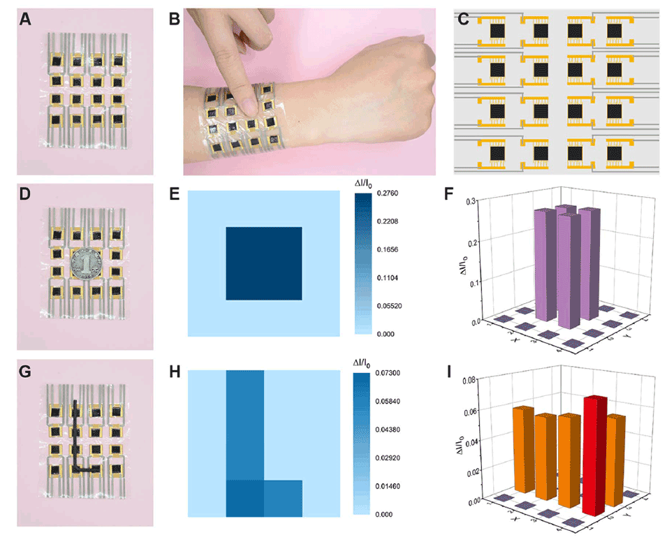 图6 (a - c)基于CNTs/OBC纤维导体的柔性4 × 4像素电子皮肤的照片和结构示意图。(D-I)电子皮肤上不同项目的照片,以及相应的空间压力分布图。