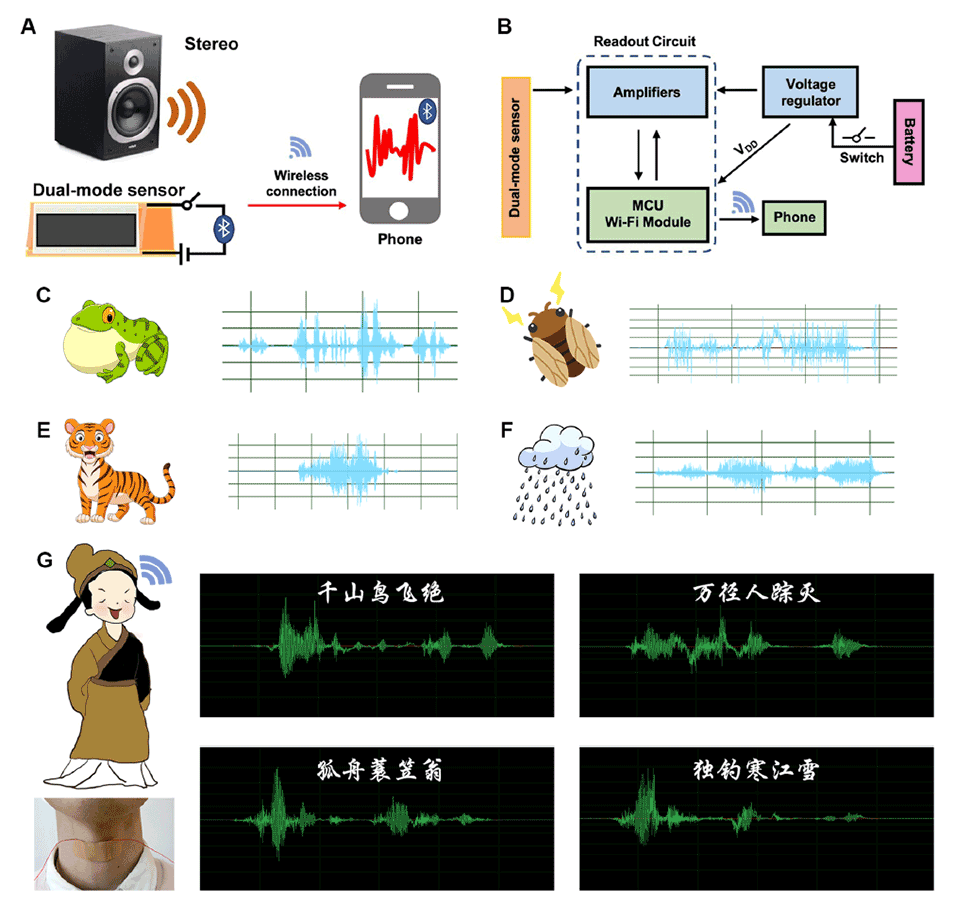 图7使用CNTs/OBC双模应变/触觉传感器的声音检测。(A、B)声音检测检测系统建设。(C-E)辨别动物的声音,包括蛙叫声、蝉叫声、虎叫声。(F)探测雨声。(G)诗歌朗诵过程中声音的视觉呈现。