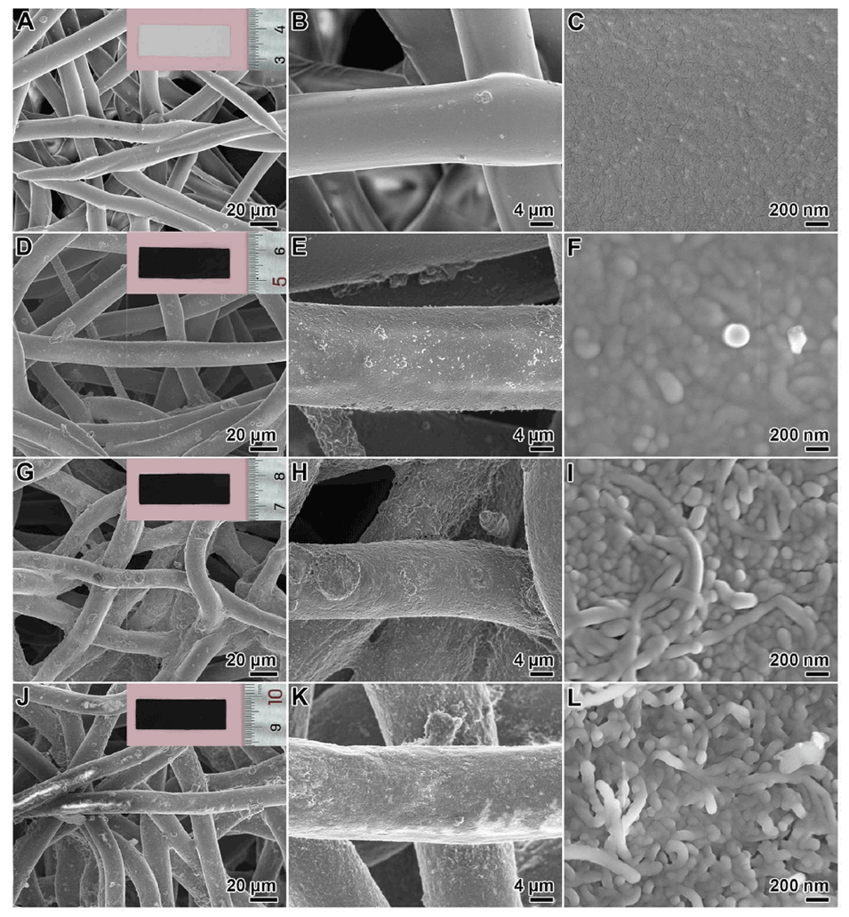 图2 (A-C)不同倍率下纯OBC微纤维基板的SEM图像。不同涂覆次数的OBC纤维碳纳米管的SEM图像:(D-F)一次(CNTs/OBCs-1), (G-I)两次(CNTs/OBCs-2), (J-L)三次(CNTs/OBCs-3)。