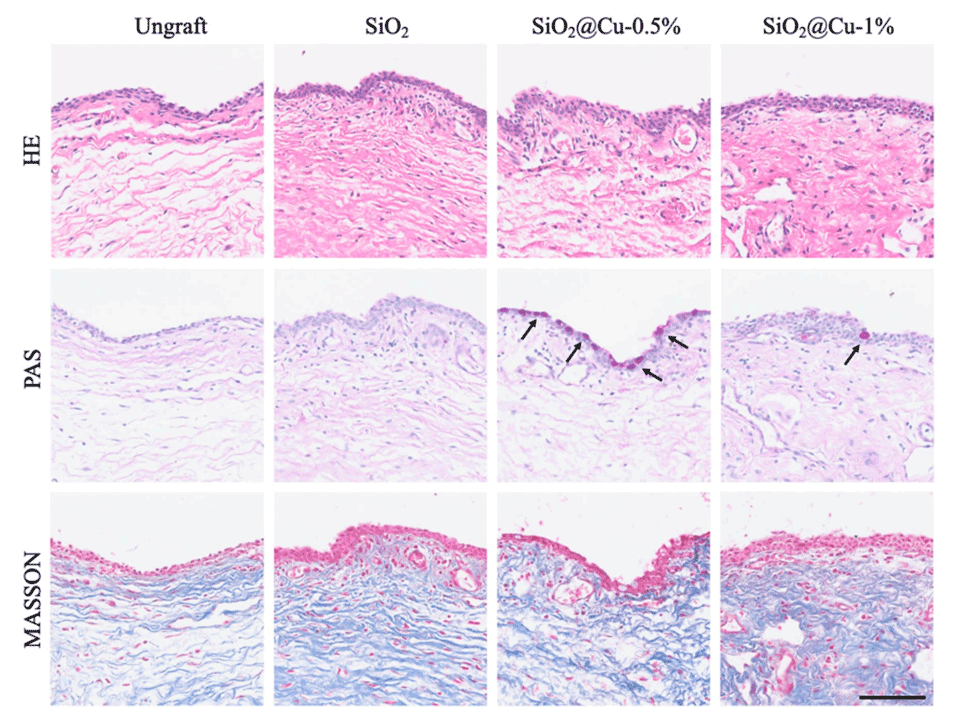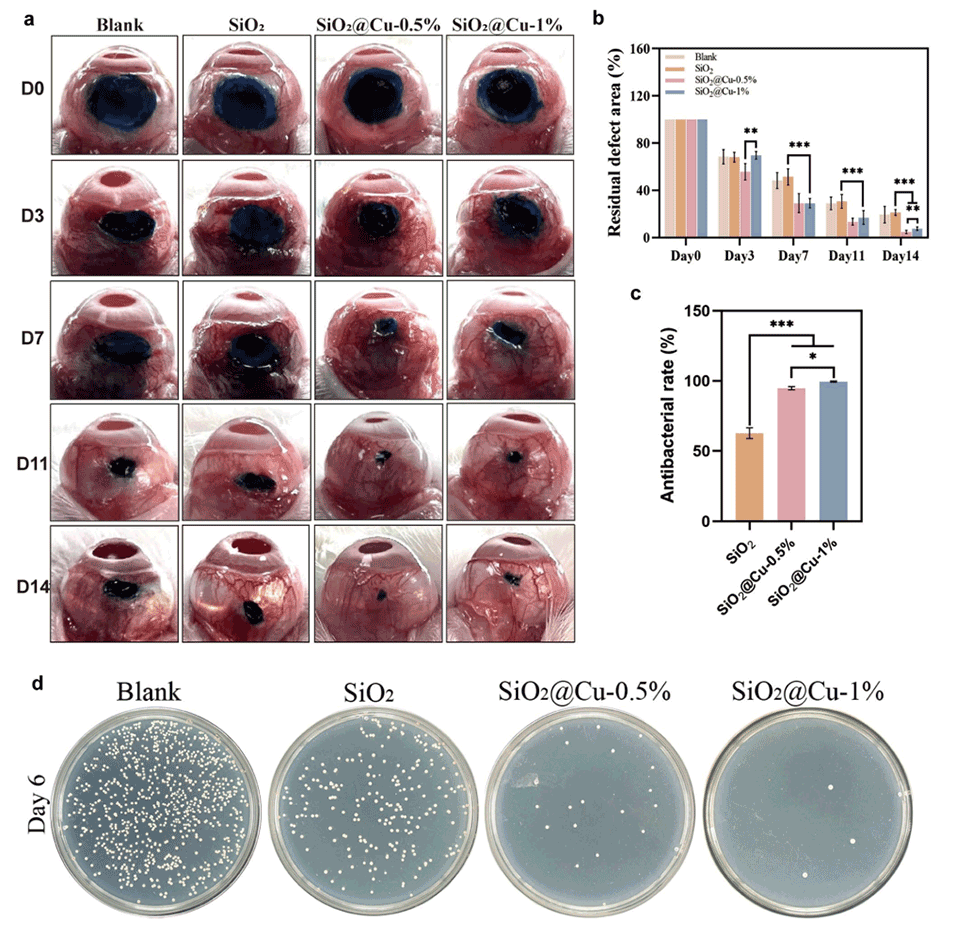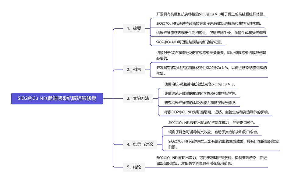 4、综上所述,SiO2@Cu NFs可能在制造替代眼绷带以抑制细菌感染和促进眼组织修复方面具有重要的前景,并且可能也用于相关学科。