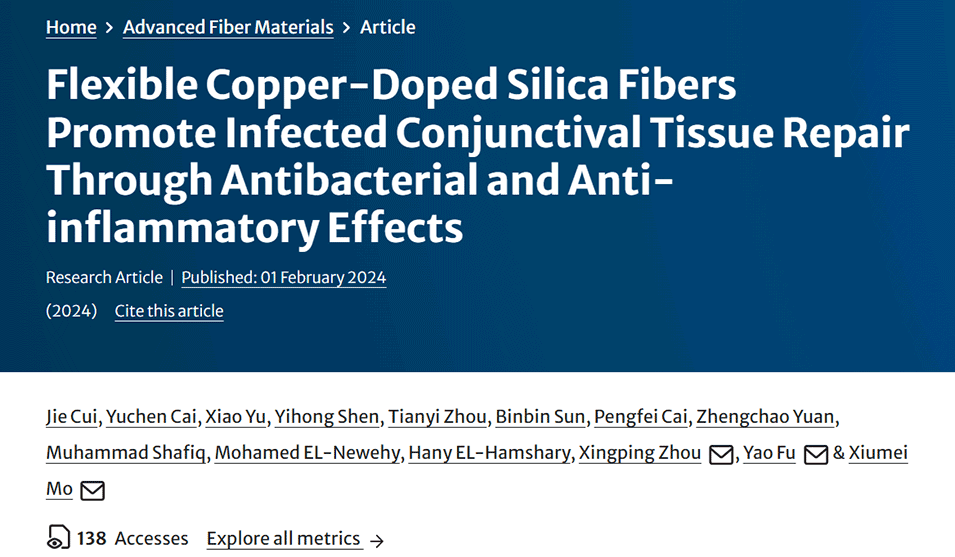 结膜对保护眼睛免受伤害或感染至关重要,从而确保视力的保存。结膜感染损伤的修复是必要的。鉴于此,东华大学莫秀梅教授和周兴平研究员等人,重点介绍了具有抗菌和抗炎作用的纳米纤维的发展,及其在结膜损伤的治疗中显示出良好的效果。相关研究成果以“Flexible Copper-Doped Silica Fibers Promote Infected Conjunctival Tissue Repair Through Antibacterial and Anti-inflammatory Effects”为题目,发表于期刊《Advanced Fiber Materials》上。