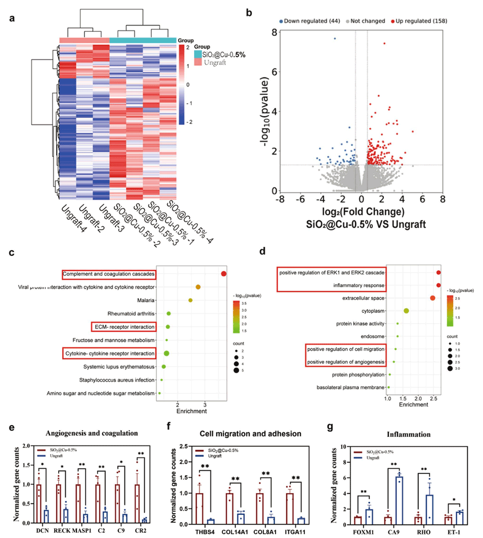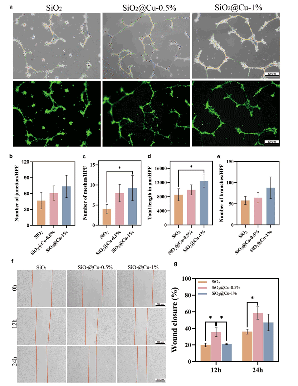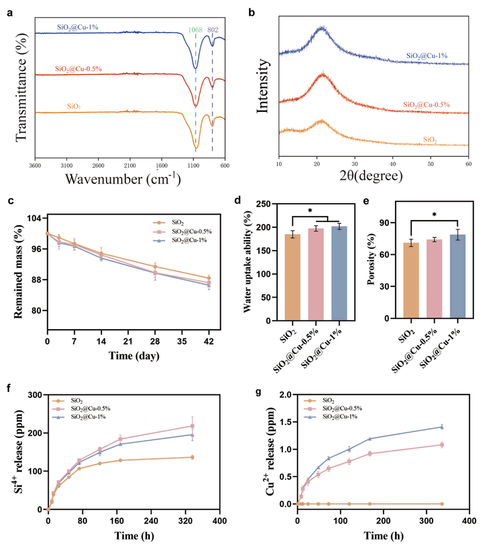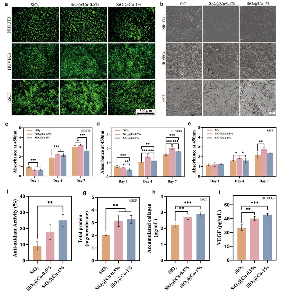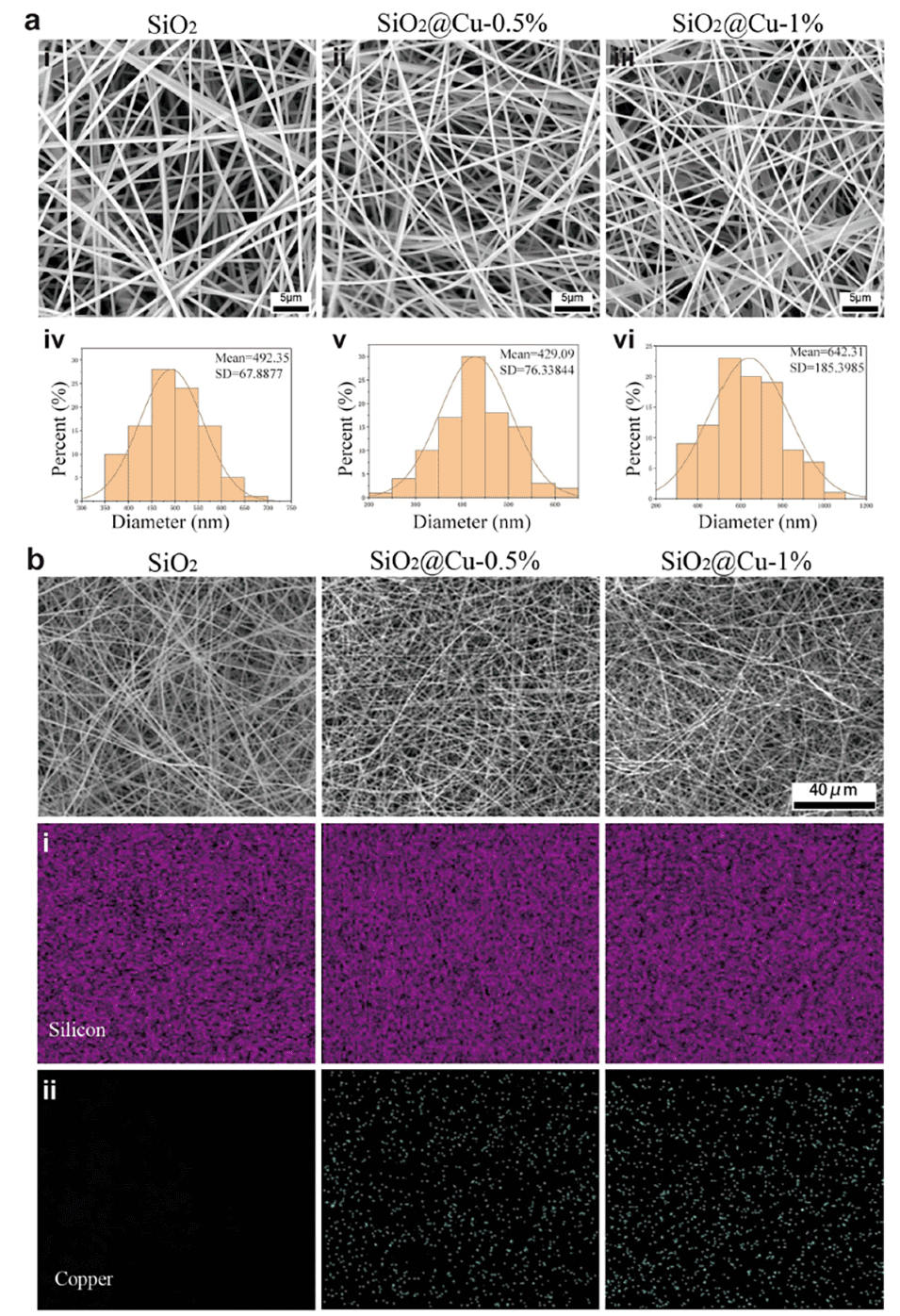1、本研究开发了具有多功能抗菌和抗炎特性的铜掺杂柔性二氧化硅纳米纤维(SiO2@Cu NFs)。