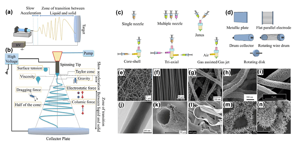 图4 静电纺丝原理、过程及电纺纳米纤维形貌结构。