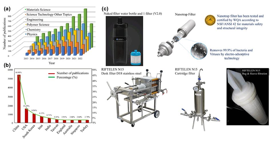 图5 (a) 2013年至2022年前六大研究领域的ENM出版物数量;(b)出版最多的前十大国家的出版物数量和百分比;(c)三种不同类型的过滤器。