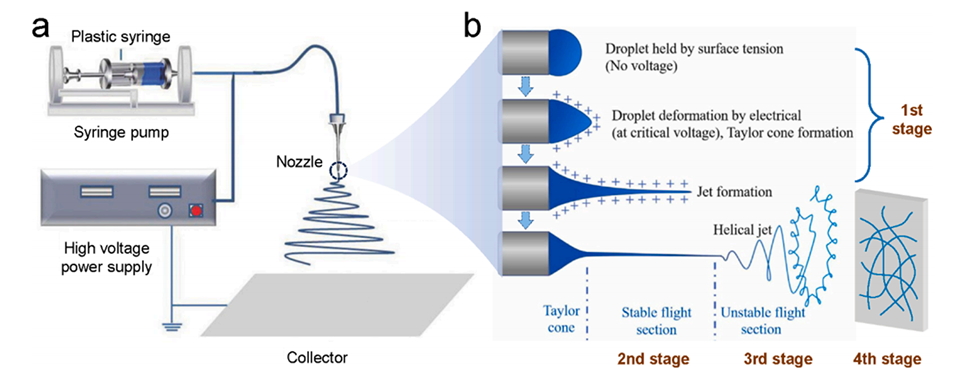 图 2. 静电纺丝技术。(a)传统装置示意图。(b)机制示意图。