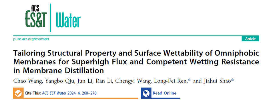 近年来,全疏膜由于具有良好的抗润湿性而在膜蒸馏(MD)中受到广泛关注。然而,高通量的全疏膜仍然缺乏,使MD成为一种更有效和可行的水处理技术。鉴于此,上海交通大学邵嘉慧教授和任龙飞副教授通过静电纺丝制备了一系列具有定制结构性能和表面润湿性的聚偏氟乙烯(PVDF)基全疏膜,实现膜蒸馏中超高通量和优异润湿性。相关研究成果以“Tailoring Structural Property and Surface Wettability of Omniphobic Membranes for Superhigh Flux and Competent Wetting Resistance in Membrane Distillation”为题目,发表于期刊《ACS ES&T Water》上。