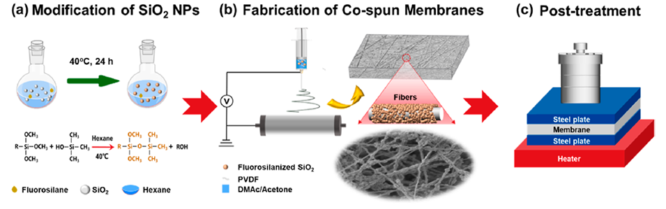 图1 (a)氟硅化SiO2纳米颗粒和(b)共纺膜的制备。(c)后处理过程。