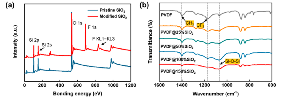 图3 (a)原始和改性SiO2 NPs的XPS(宽扫描)光谱。(b) PVDF膜和cospun膜的FTIR光谱。