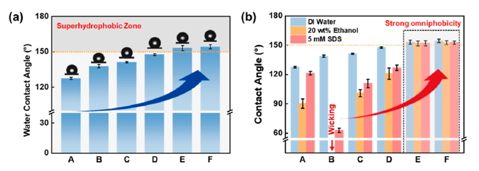 图4 (a)被测膜的wca(a: GVHP;B: PVDF膜;C: PVDF@25%SiO2;D: PVDF@50%SiO2;E:PVDF@100%SiO2;F:PVDF@150%SiO2)和(b)以20 wt %乙醇溶液和5 mM SDS溶液为介质液体的被测膜的CAs。