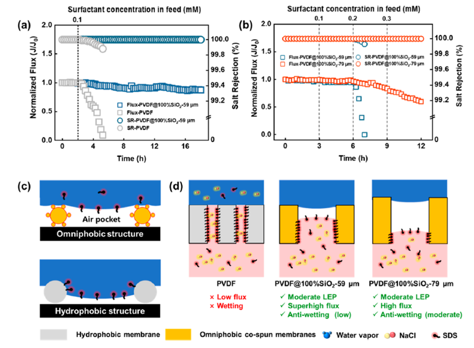 图5 (a)以含0.1 mM SDS的3.5 wt % NaCl溶液为进料,PVDF@100%SiO2-59 μm与PVDF膜的润湿实验。(b)随着SDS剂量的增加,PVDF@100%SiO2-59 μm和PVDF@100%SiO2-79 μm的润湿实验。(c)全疏气结构和疏水结构的示意图。(d)不同润湿动力学下PVDF膜、PVDF@ 100%SiO2-59 μm和PVDF@100%SiO2-79 μm的原理图。