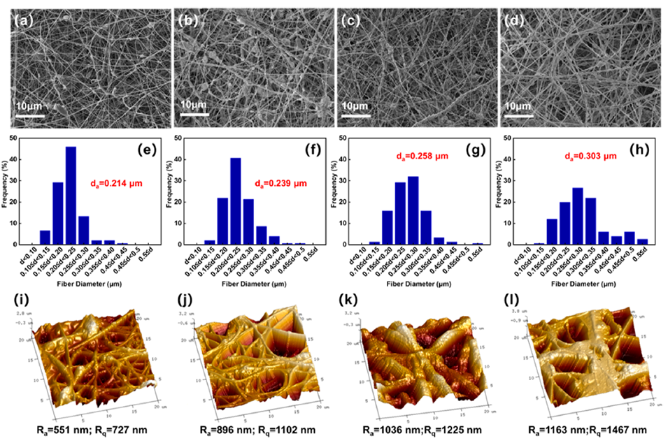 图2分别为PVDF@25%SiO2、PVDF@50%SiO2、PVDF@100%SiO2和PVDF@150%SiO2的SEM表面图像(a−d)、纤维直径分布(e−h)和AFM表面图像(i−l)。